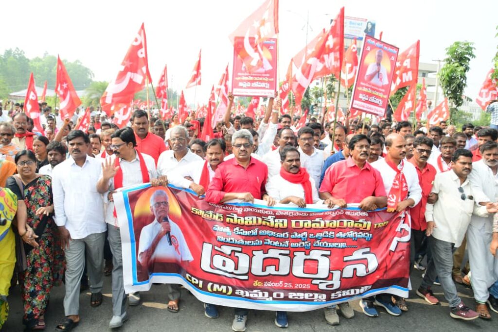 The delay by the police in arresting the murderers of CPM leader Samineni Rama Rao has sparked intense anger among party members and supporters. The protest erupted after 26 days passed since Rama Rao’s murder in his native village of Patharlapadu, in Chintakani Mandal, without the culprits being caught. On Tuesday, the CPM organized a massive protest, which was joined by leaders and activists from the BRS, CPI, and CPI(ML) New Democracy parties. The demonstrators, including Rama Rao’s wife, Swarajyam, and his son, Vijay, staged a dharna (sit-in protest) outside the Khammam Collectorate . When the protesters attempted to force their way into the Collectorate, police personnel intercepted them, leading to a scuffle and a few moments of tension. The demonstration lasted for about three hours.