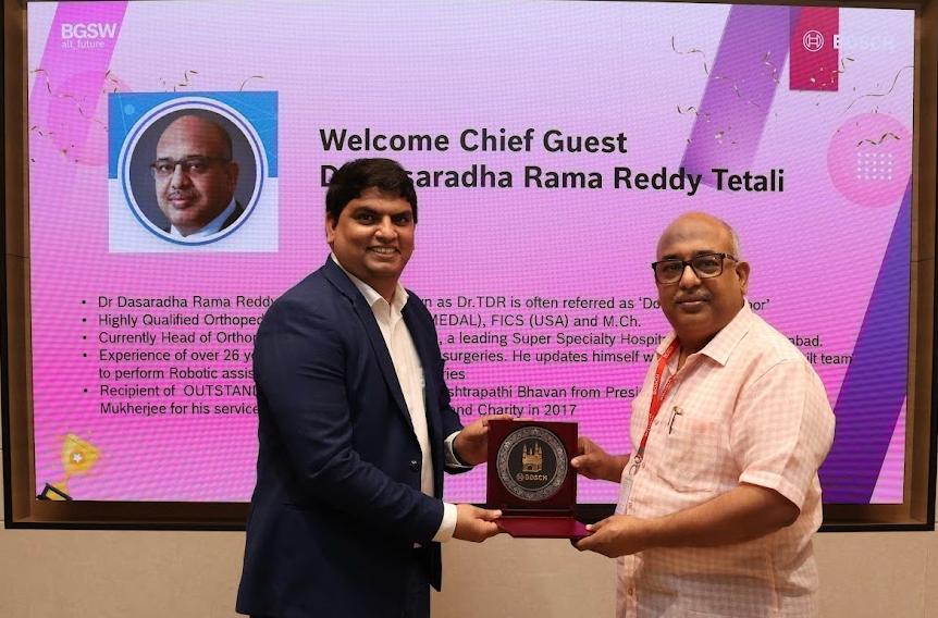 Bosch Global Software Technologies Private Limited, the renowned German automobile company, honoured the Yashoda Hospitals Chief Orthopaedic Surgeon Dr. Dasaradha Rama Reddy, at their Hyderabad campus. Dr. Rama Reddy was the Chief Guest for the closing ceremony of the company’s annual sports meet held on Tuesday. During the ceremony, the Head of Bosch, Hyderabad, Amjad Khan Pathan, presented Dr. Rama Reddy with a memento as a token of appreciation. Before the felicitation, Dr. Dasaradha Rama Reddy addressed the Bosch employees, focusing his talk on essential health and safety precautions to be taken both while performing desk jobs and participating in sports.